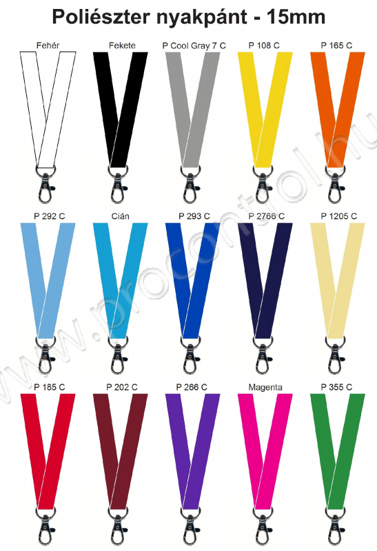 A poliészter passztartó matt kivitelezésű, lágy tapintású nyakba akasztó, mely anyagánál fogva erőteljesebb. Ennek köszönhetően kiválóan alkalmas nehezebb tárgyak rögzítésére is. Ennél a szalagtípusnál lehetőség van arra, hogy a passztartóra elhelyezett tolzár segítségével egy bármikor különválasztható verziót kaphassunk. A poliészter passztartók szitanyomással feliratozhatóak.