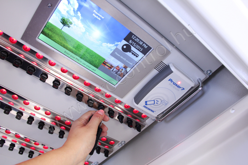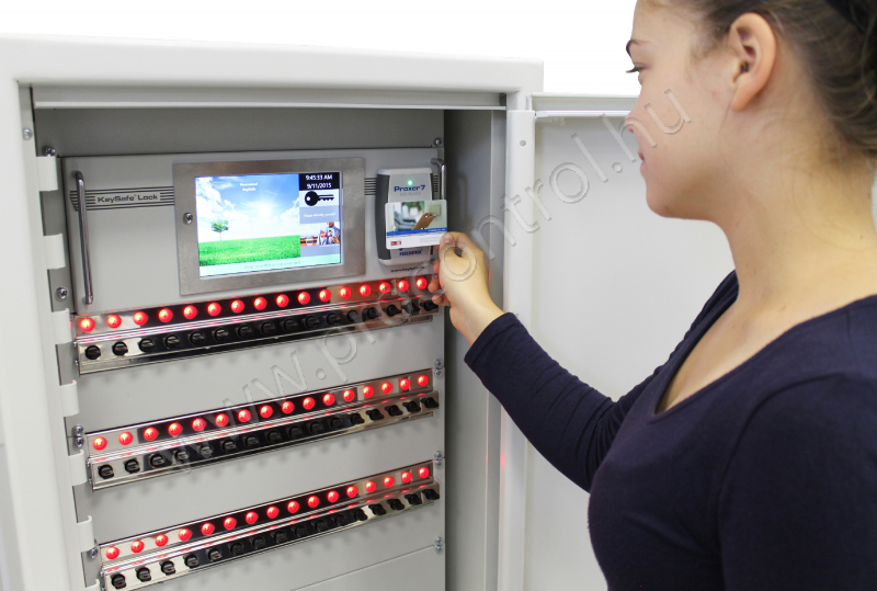 Der KeySafe Lock Schlüsserschrank ist eine sorgfältige Lösung in der besonders schutzbedürfigten Bereichen. Seine Tür öffnet sich mit RFID Proximity Leser oder optionell Fingerabdruckleser. Das integrierte Touchscreen Display funktioniert selbstständig, aber wir können überwachen wer, wann und welcher Schlüssel nimmt mit über einen angeschlossenen PC.