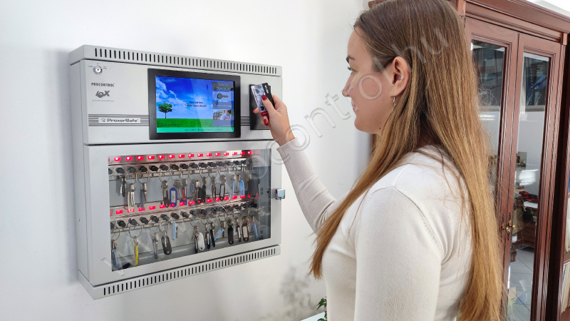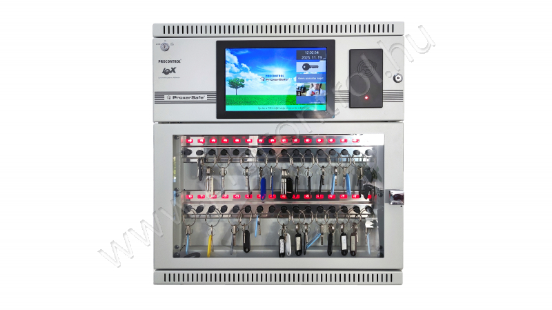 Der KeySafe Lock Schlüsserschrank ist eine sorgfältige Lösung in der besonders schutzbedürfigten Bereichen. Seine Tür öffnet sich mit RFID Proximity Leser oder optionell Fingerabdruckleser. Das integrierte Touchscreen Display funktioniert selbstständig, aber wir können überwachen wer, wann und welcher Schlüssel nimmt mit über einen angeschlossenen PC.