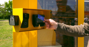ProxerCollect 15 motorized, retracting belt card and wristband absorption column, for automatic collection of RFID proximity access cards, cards and wristbands, cards stored in a case and cards mounted with a clip or lanyard.